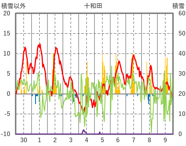 | 日 | 時 | 気温 | 降水 | 風向/風速 | 日照 | 積雪 | 降雪 |