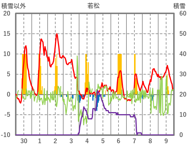 | 日 | 時 | 気温 | 降水 | 風向/風速 | 日照 | 積雪 | 降雪 |