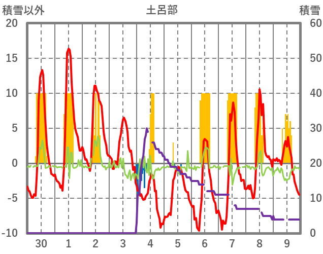 | 日 | 時 | 気温 | 降水 | 風向/風速 | 日照 | 積雪 | 降雪 |