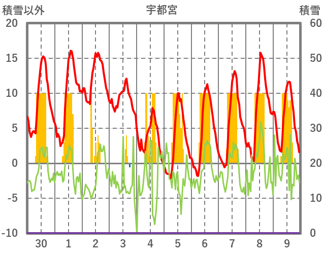 | 日 | 時 | 気温 | 降水 | 風向/風速 | 日照 | 積雪 | 降雪 |