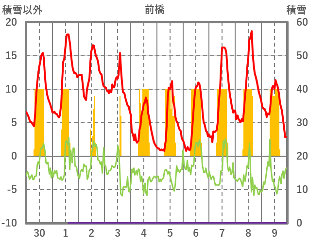 | 日 | 時 | 気温 | 降水 | 風向/風速 | 日照 | 積雪 | 降雪 |