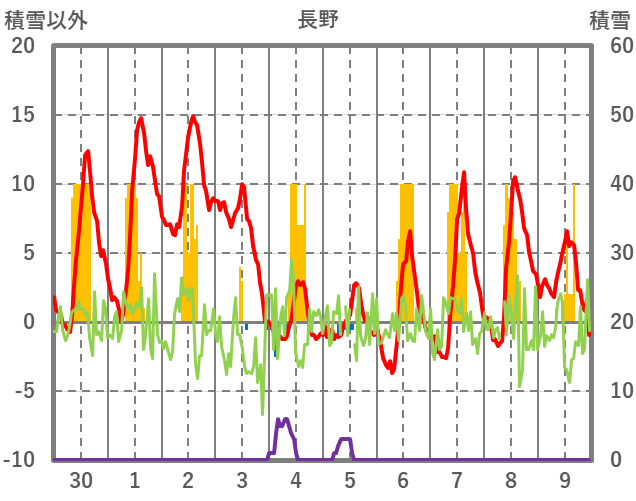 | 日 | 時 | 気温 | 降水 | 風向/風速 | 日照 | 積雪 | 降雪 |