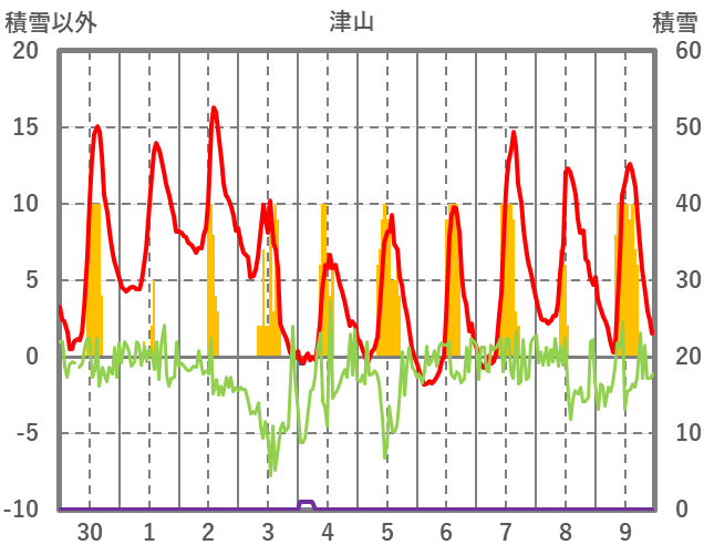 | 日 | 時 | 気温 | 降水 | 風向/風速 | 日照 | 積雪 | 降雪 |