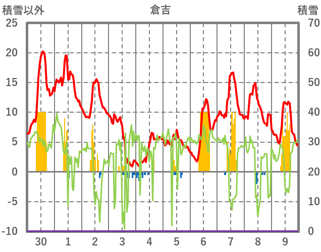 | 日 | 時 | 気温 | 降水 | 風向/風速 | 日照 | 積雪 | 降雪 |
