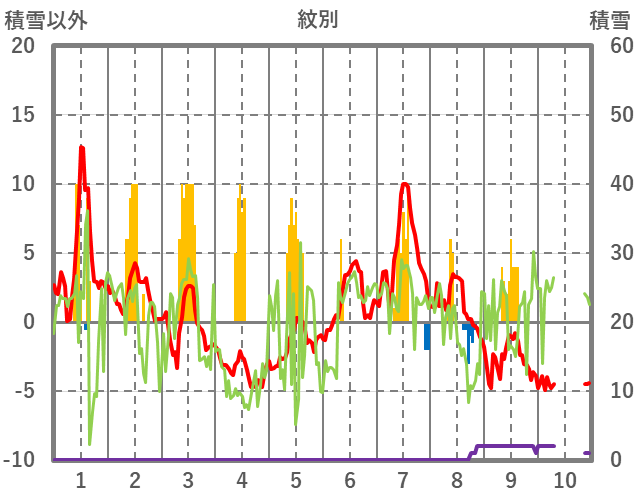 | 日 | 時 | 気温 | 降水 | 風向/風速 | 日照 | 積雪 | 降雪 |