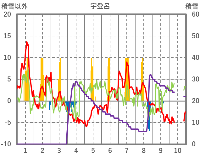 | 日 | 時 | 気温 | 降水 | 風向/風速 | 日照 | 積雪 | 降雪 |