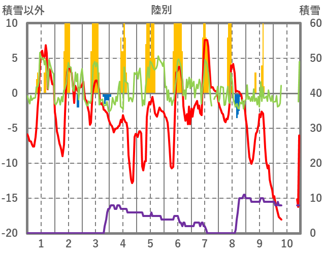 | 日 | 時 | 気温 | 降水 | 風向/風速 | 日照 | 積雪 | 降雪 |