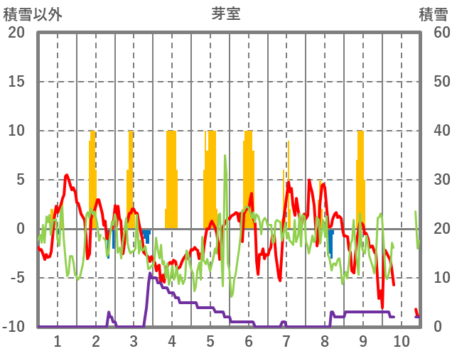 | 日 | 時 | 気温 | 降水 | 風向/風速 | 日照 | 積雪 | 降雪 |