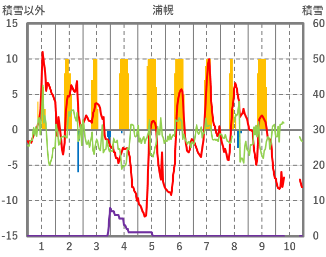 | 日 | 時 | 気温 | 降水 | 風向/風速 | 日照 | 積雪 | 降雪 |