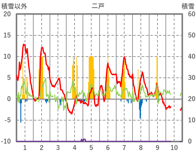 | 日 | 時 | 気温 | 降水 | 風向/風速 | 日照 | 積雪 | 降雪 |