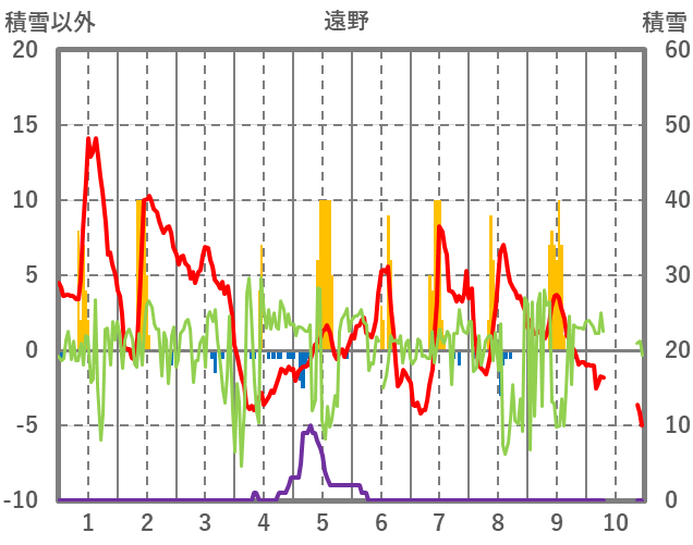 | 日 | 時 | 気温 | 降水 | 風向/風速 | 日照 | 積雪 | 降雪 |