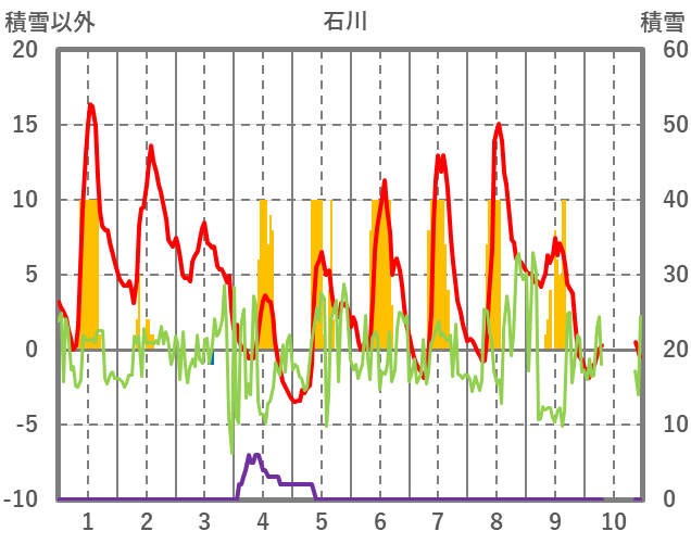 | 日 | 時 | 気温 | 降水 | 風向/風速 | 日照 | 積雪 | 降雪 |