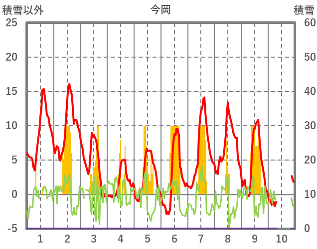 | 日 | 時 | 気温 | 降水 | 風向/風速 | 日照 | 積雪 | 降雪 |