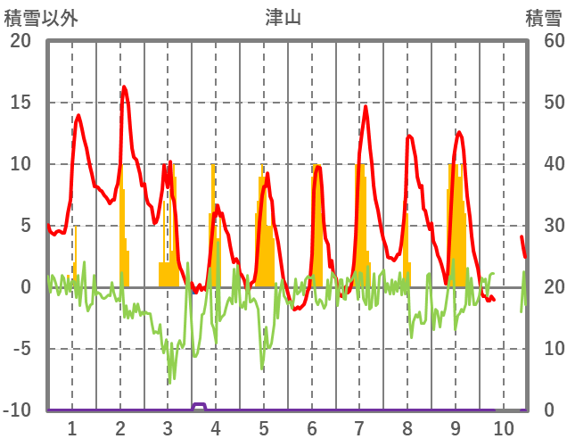 | 日 | 時 | 気温 | 降水 | 風向/風速 | 日照 | 積雪 | 降雪 |