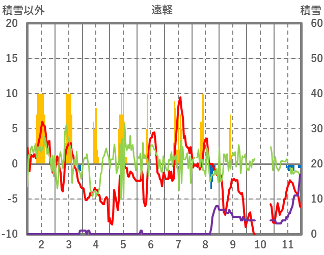 | 日 | 時 | 気温 | 降水 | 風向/風速 | 日照 | 積雪 | 降雪 |