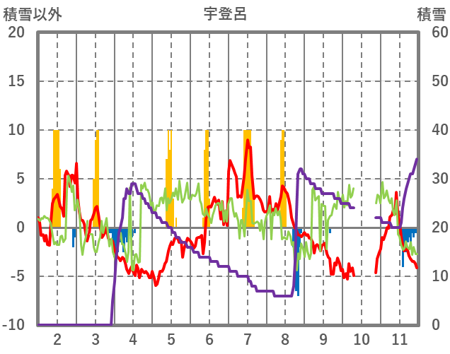 | 日 | 時 | 気温 | 降水 | 風向/風速 | 日照 | 積雪 | 降雪 |
