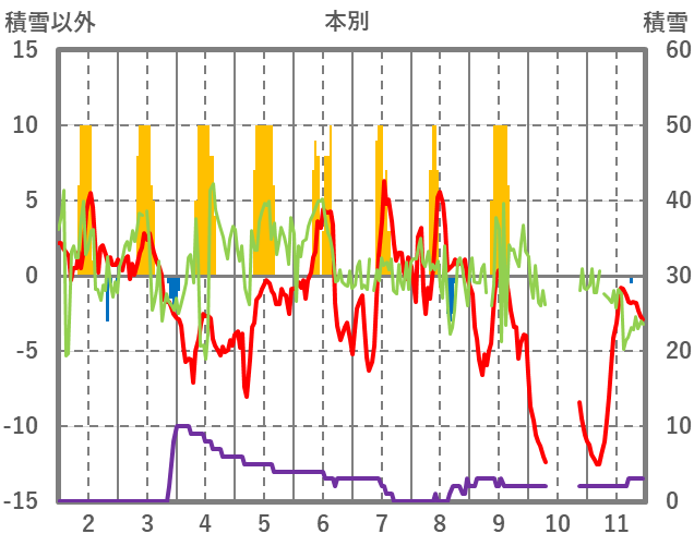 | 日 | 時 | 気温 | 降水 | 風向/風速 | 日照 | 積雪 | 降雪 |