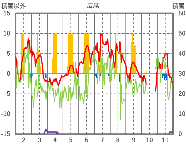 | 日 | 時 | 気温 | 降水 | 風向/風速 | 日照 | 積雪 | 降雪 |