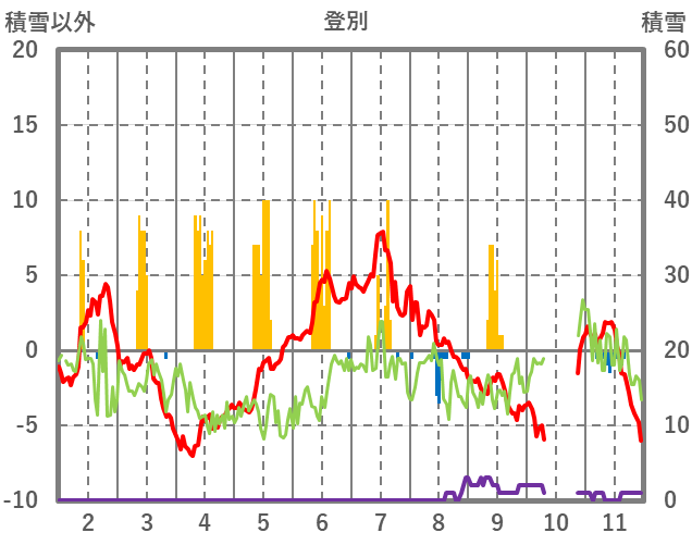 | 日 | 時 | 気温 | 降水 | 風向/風速 | 日照 | 積雪 | 降雪 |