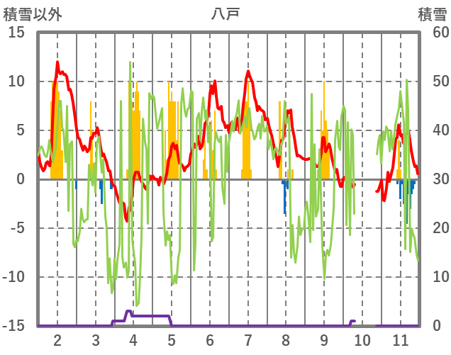 | 日 | 時 | 気温 | 降水 | 風向/風速 | 日照 | 積雪 | 降雪 |
