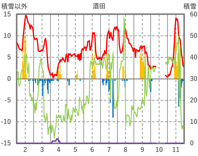 | 日 | 時 | 気温 | 降水 | 風向/風速 | 日照 | 積雪 | 降雪 |