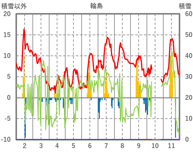 | 日 | 時 | 気温 | 降水 | 風向/風速 | 日照 | 積雪 | 降雪 |
