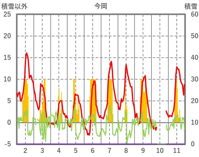 | 日 | 時 | 気温 | 降水 | 風向/風速 | 日照 | 積雪 | 降雪 |