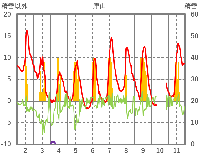 | 日 | 時 | 気温 | 降水 | 風向/風速 | 日照 | 積雪 | 降雪 |