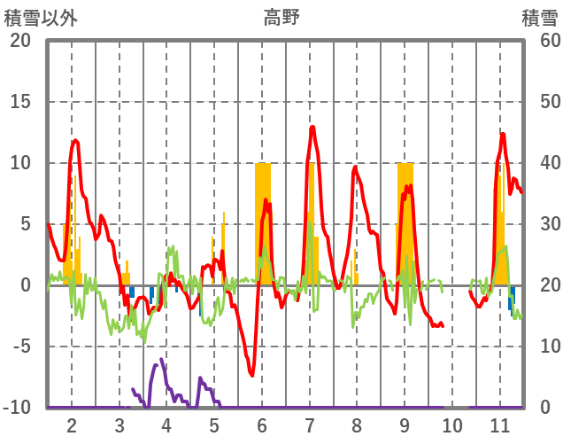 | 日 | 時 | 気温 | 降水 | 風向/風速 | 日照 | 積雪 | 降雪 |
