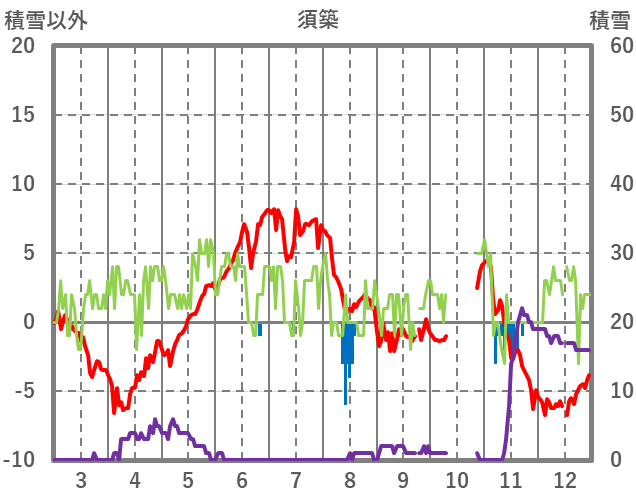 | 日 | 時 | 気温 | 降水 | 風向/風速 | 日照 | 積雪 | 降雪 |