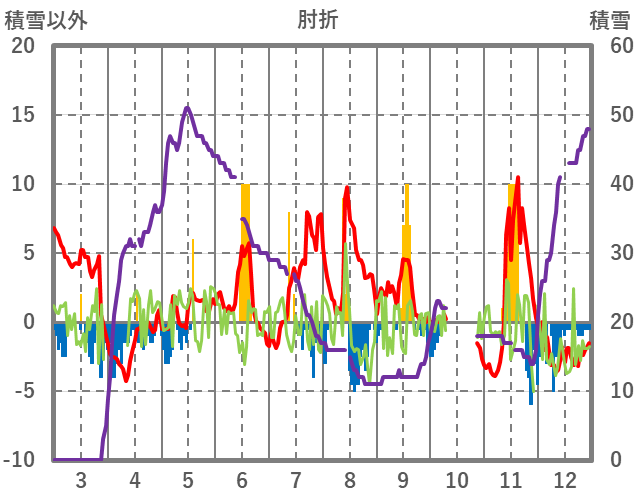 | 日 | 時 | 気温 | 降水 | 風向/風速 | 日照 | 積雪 | 降雪 |