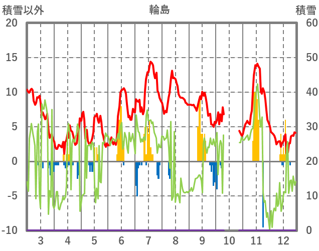 | 日 | 時 | 気温 | 降水 | 風向/風速 | 日照 | 積雪 | 降雪 |