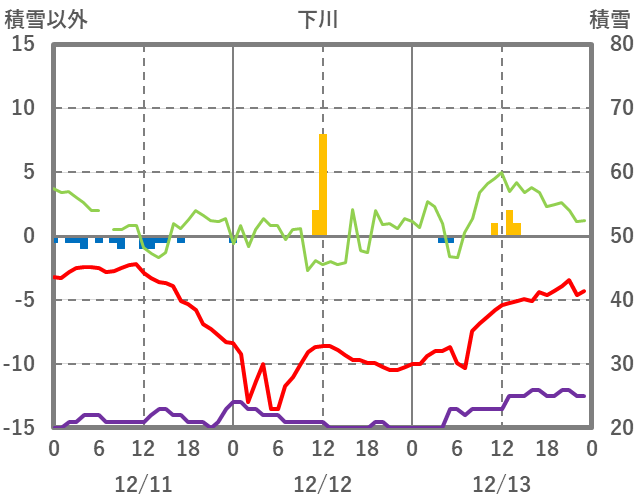 | 日 | 時 | 気温 | 降水 | 風向/風速 | 日照 | 積雪 | 降雪 |