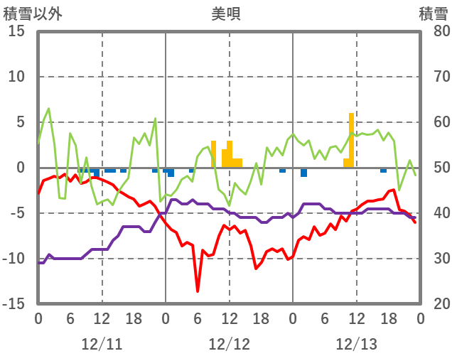| 日 | 時 | 気温 | 降水 | 風向/風速 | 日照 | 積雪 | 降雪 |
