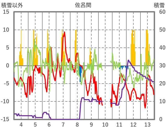 | 日 | 時 | 気温 | 降水 | 風向/風速 | 日照 | 積雪 | 降雪 |
