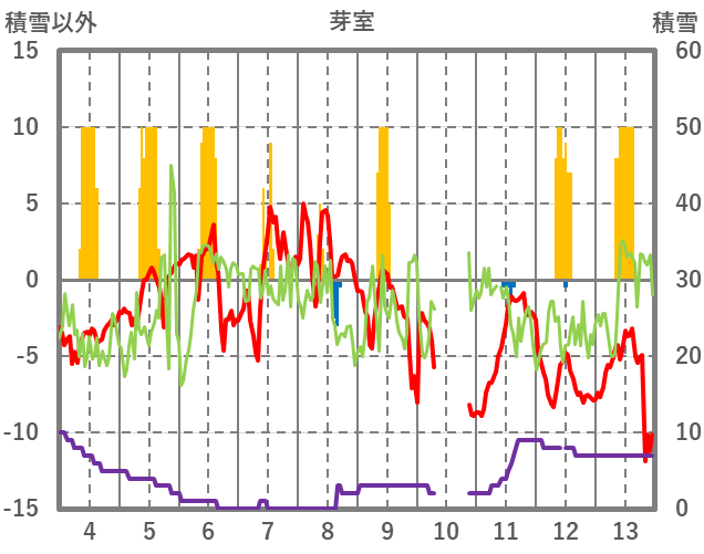 | 日 | 時 | 気温 | 降水 | 風向/風速 | 日照 | 積雪 | 降雪 |
