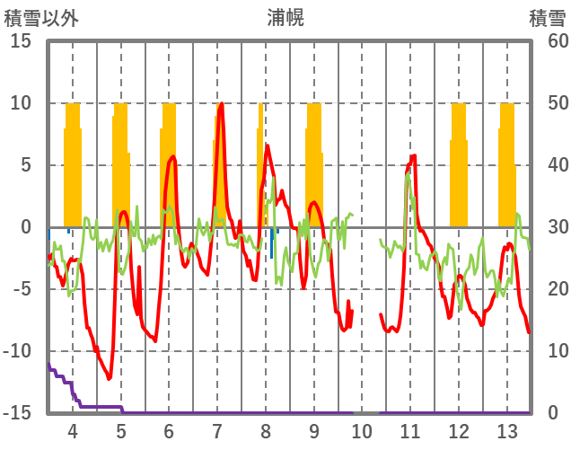 | 日 | 時 | 気温 | 降水 | 風向/風速 | 日照 | 積雪 | 降雪 |