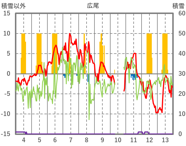 | 日 | 時 | 気温 | 降水 | 風向/風速 | 日照 | 積雪 | 降雪 |