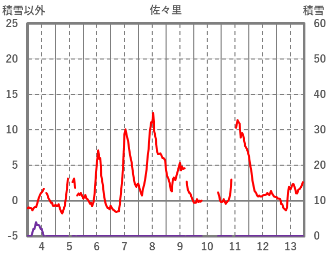 | 日 | 時 | 気温 | 降水 | 風向/風速 | 日照 | 積雪 | 降雪 |