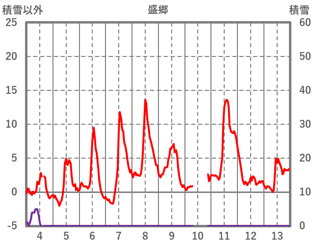 | 日 | 時 | 気温 | 降水 | 風向/風速 | 日照 | 積雪 | 降雪 |