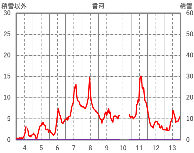 | 日 | 時 | 気温 | 降水 | 風向/風速 | 日照 | 積雪 | 降雪 |