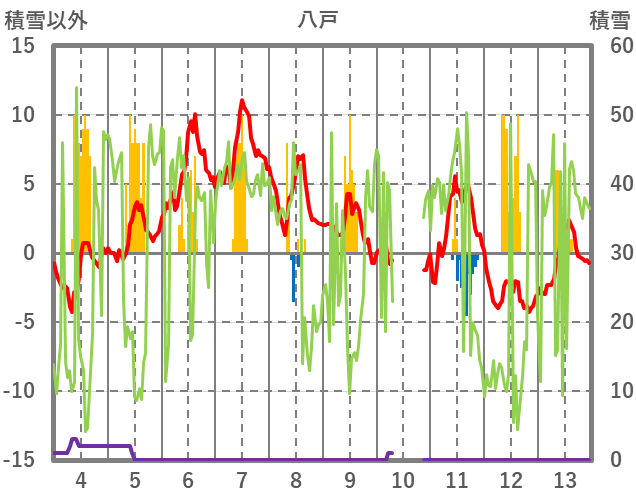 | 日 | 時 | 気温 | 降水 | 風向/風速 | 日照 | 積雪 | 降雪 |