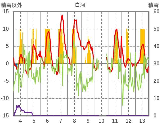 | 日 | 時 | 気温 | 降水 | 風向/風速 | 日照 | 積雪 | 降雪 |