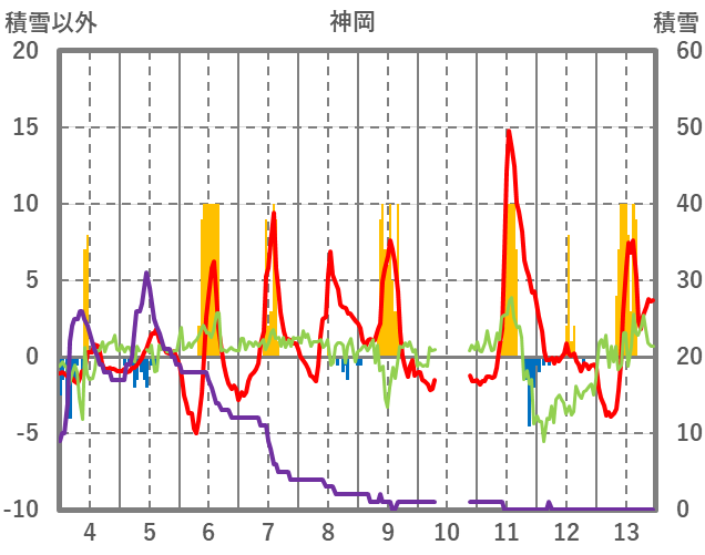 | 日 | 時 | 気温 | 降水 | 風向/風速 | 日照 | 積雪 | 降雪 |