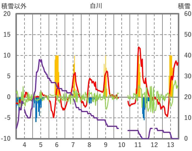 | 日 | 時 | 気温 | 降水 | 風向/風速 | 日照 | 積雪 | 降雪 |