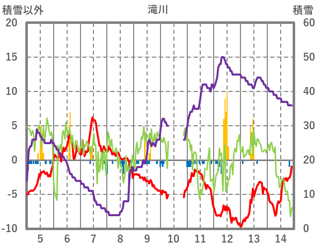 | 日 | 時 | 気温 | 降水 | 風向/風速 | 日照 | 積雪 | 降雪 |