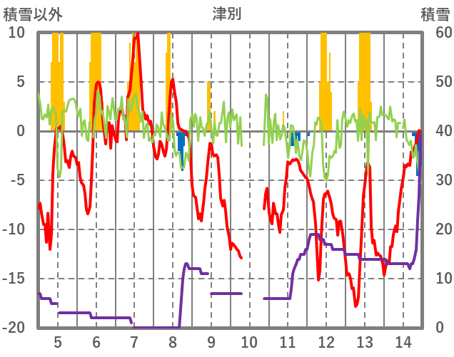 | 日 | 時 | 気温 | 降水 | 風向/風速 | 日照 | 積雪 | 降雪 |