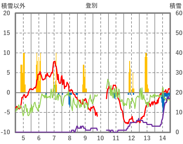 | 日 | 時 | 気温 | 降水 | 風向/風速 | 日照 | 積雪 | 降雪 |
