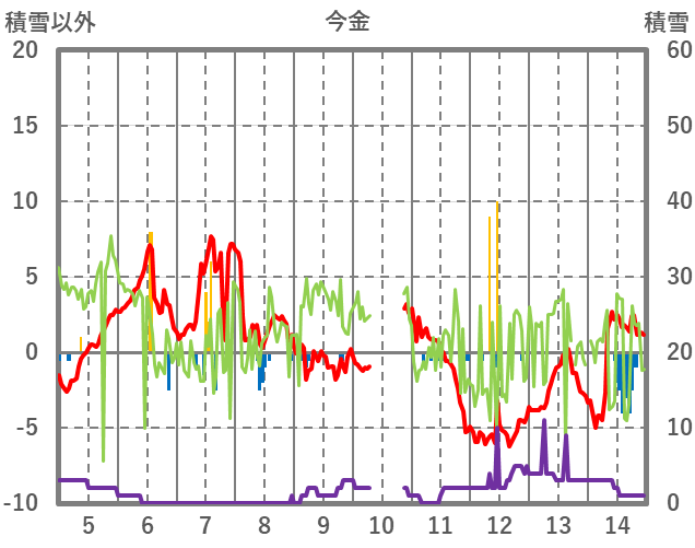 | 日 | 時 | 気温 | 降水 | 風向/風速 | 日照 | 積雪 | 降雪 |