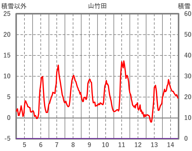 | 日 | 時 | 気温 | 降水 | 風向/風速 | 日照 | 積雪 | 降雪 |